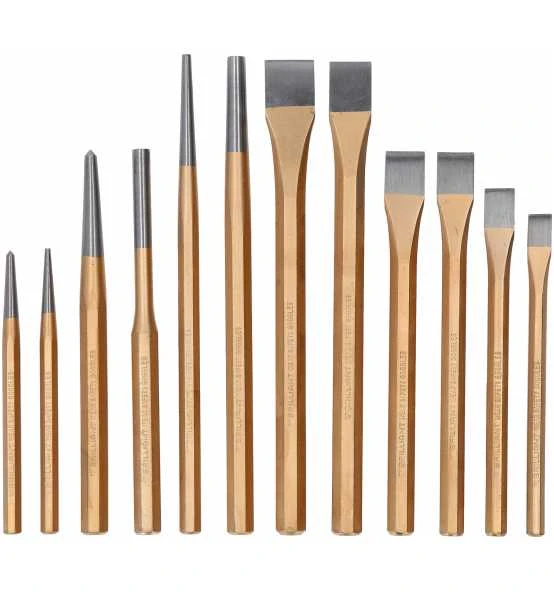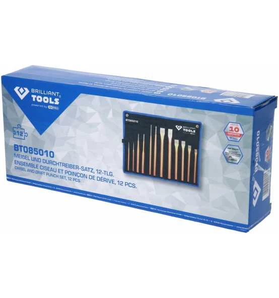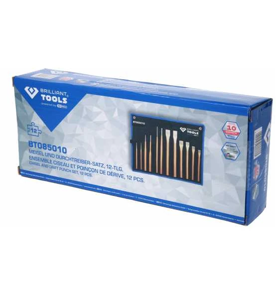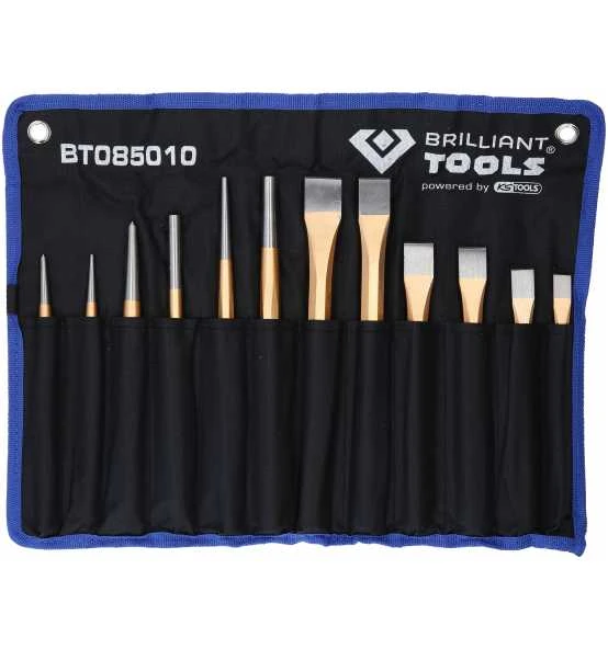 Der 12 teilige BRILLIANT TOOLS Meißel und Durchtreiber-Satz BT085010 ist eine praktische Zusammenstellung der gängigsten Durchtreiber und Meißel. Hergestellt wurden die Werkzeuge aus Chrom-Vanadium und Werkzeugstahl. Sie wurden in einem Gesenk geschmiedet und thermisch gehärtet. Für optimales Handling sorgt der Sechskant-Schaft. Die Flachmeißel werden für allgemeine Meißel- und Aufbrucharbeiten von Mauerwerk, Beton und losem Gestein mit gezielter Brechwirkung eingesetzt. Alle Schneiden besitzen eine flache Form für optimale Kraftverteilung. Der Meißel und Durchtreiber-Satz wird in einer praktischen Aufbewahrungstasche geliefert die mit Aufhängeösen ausgestattet ist.