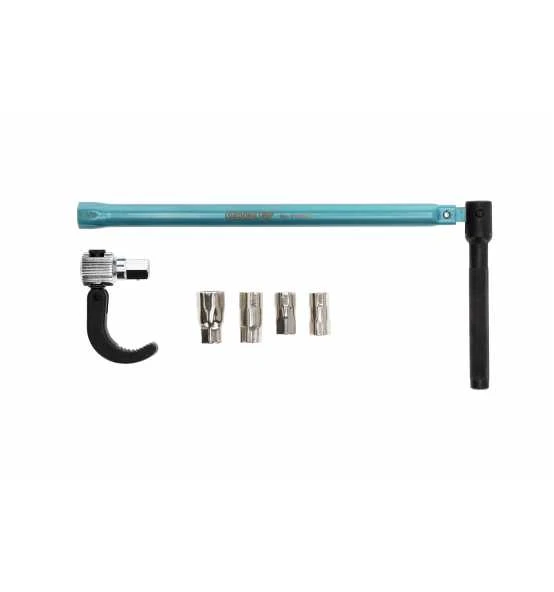Für Einhebelmischbatterien und Standhähne mit zentraler Verschraubung bis SW 36 mm, Mit 13 mm Sechskantantrieb und zusätzlichen Einsätzen für 9, 10, 11 und 14 mm, Schwenkbare Klaue für Rechts- und Linksgang, Blau lackiert