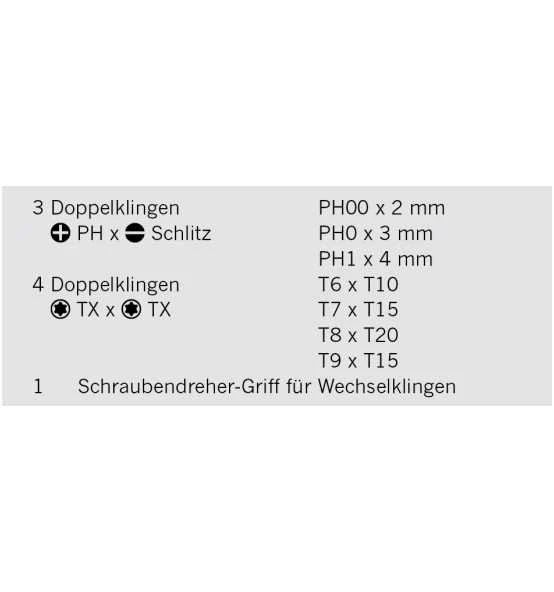 3 Doppelklingen 120 mm: PH00 x 2 mm – PH0 x 3 mm – PH1 x 4 mm