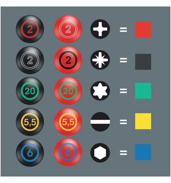 „Take it easy“ Werkzeugfinder mit Farbkennzeichnung nach Profilen und Größenstempelung – zum einfachen und schnellen Finden des benötigten Werkzeugs.