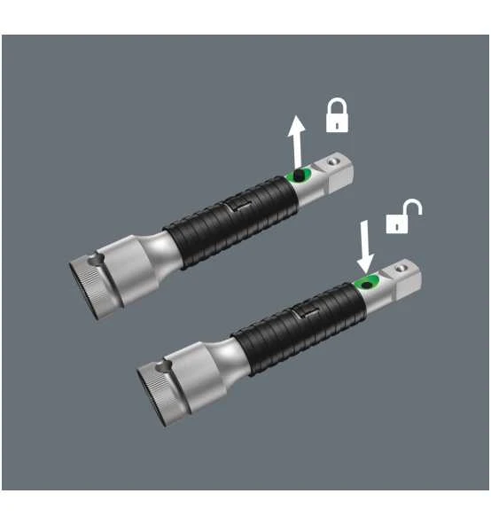 Wera Zyklop Verlängerung mit flexible-lock: Mit aktiviertem System können die Steckschlüsseleinsätze dauerhaft gesichert werden, ungewollter Verlust wird vermieden.