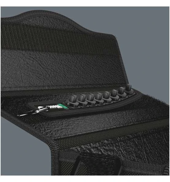 Robuster Textilgurt (Belt) im typischen Wera Design für 9 Nüsse (1/4″) auf engstem Raum.