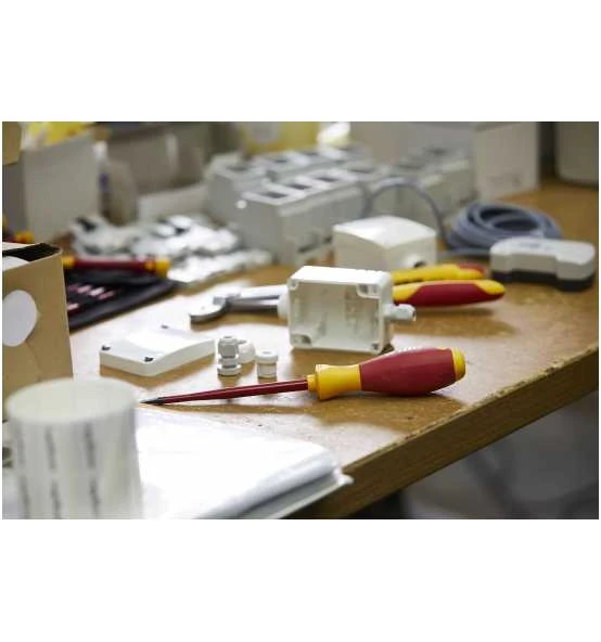 Beim händischen Verschrauben werden auf Dauer die Handgelenke und Muskeln stark belastet. Abhilfe verschafft der besonders ergonomisch geformte SoftFinish Schraubendreher, der für eine optimale Übertragung der Handkraft sorgt. Mit den langen, schlanken Griffgrößen können kleine Schrauben sicher und schnell eingedreht werden. Für das Eindrehen großer Schrauben gibt es großvolumige Griffgrößen, mit denen höhere Drehmomente aufgebracht werden können. Außerdem sind die verschiedenen Griffgrößen an die stets gleich große Hand von schraubenden Profis angepasst. Der Abrollschutz und das am Griffende aufgedruckte Schraubensymbol sorgen für effizientes Arbeiten. Bei der speziell für elektrische Anwendungen entwickelten Wiha slimTECHNOLOGY wurde die Schutzlisolation in die Klinge intergriert, um bis zu 33% schlankere Klingen zu ermöglichen. So können auch tiefliegende Schraub- und Federelemente mühelos erreicht werden. Die isolierten Schraubendreher werden gemäß der internationalen Norm IEC 60900 einer Stückprüfung unterzogen und ermöglichen ein sicheres Arbeiten im Bereich von spannungsführenden Teilen bis 1.000 V AC.